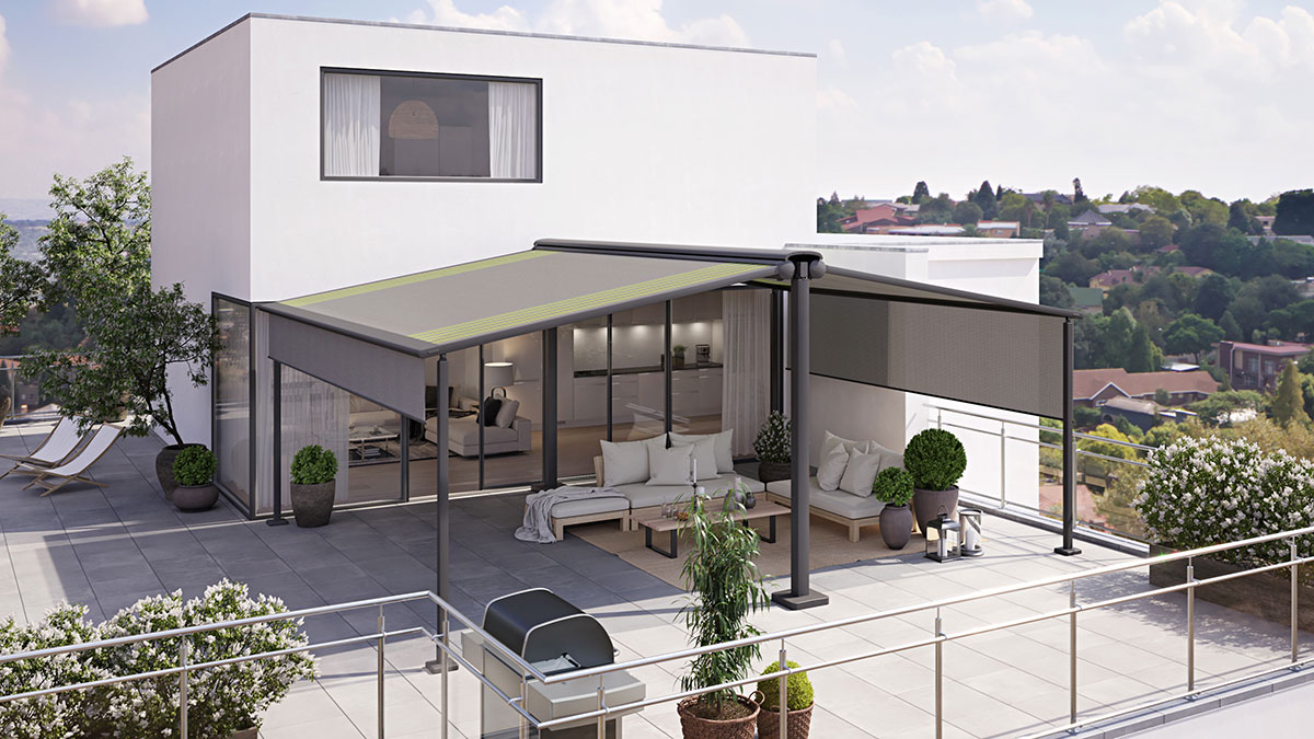 An einer oder an beiden Seiten der syncra werden je nach Anforderung Gelenkarm-Markisen oder markilux Pergolen montiert. Das System kann fest im Boden verankert (Variante "fix") oder frei mit Beschwerungskästen aufgestellt werden (Variante "flex)."